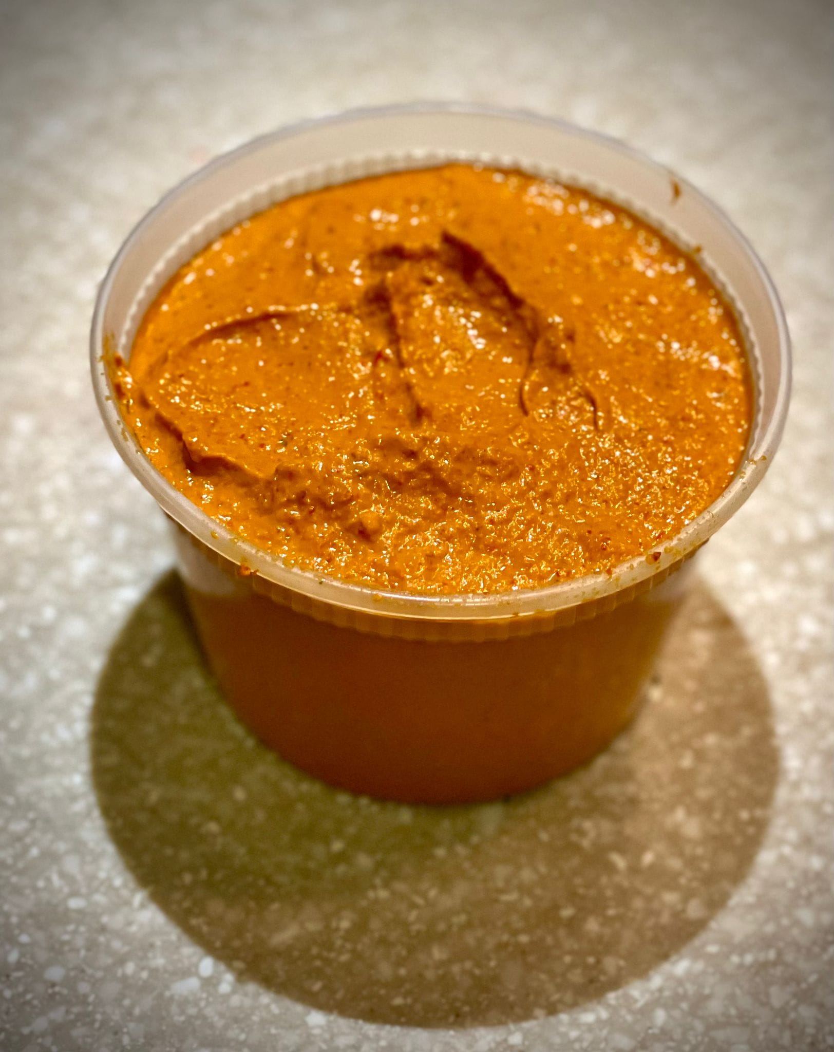 Mesquite smoked pork, roasted red poblano, garlic and lime hot sauce., blackened poblano chili sauce, jalapeño garlic hot sauce, and a gooseberry salsa.